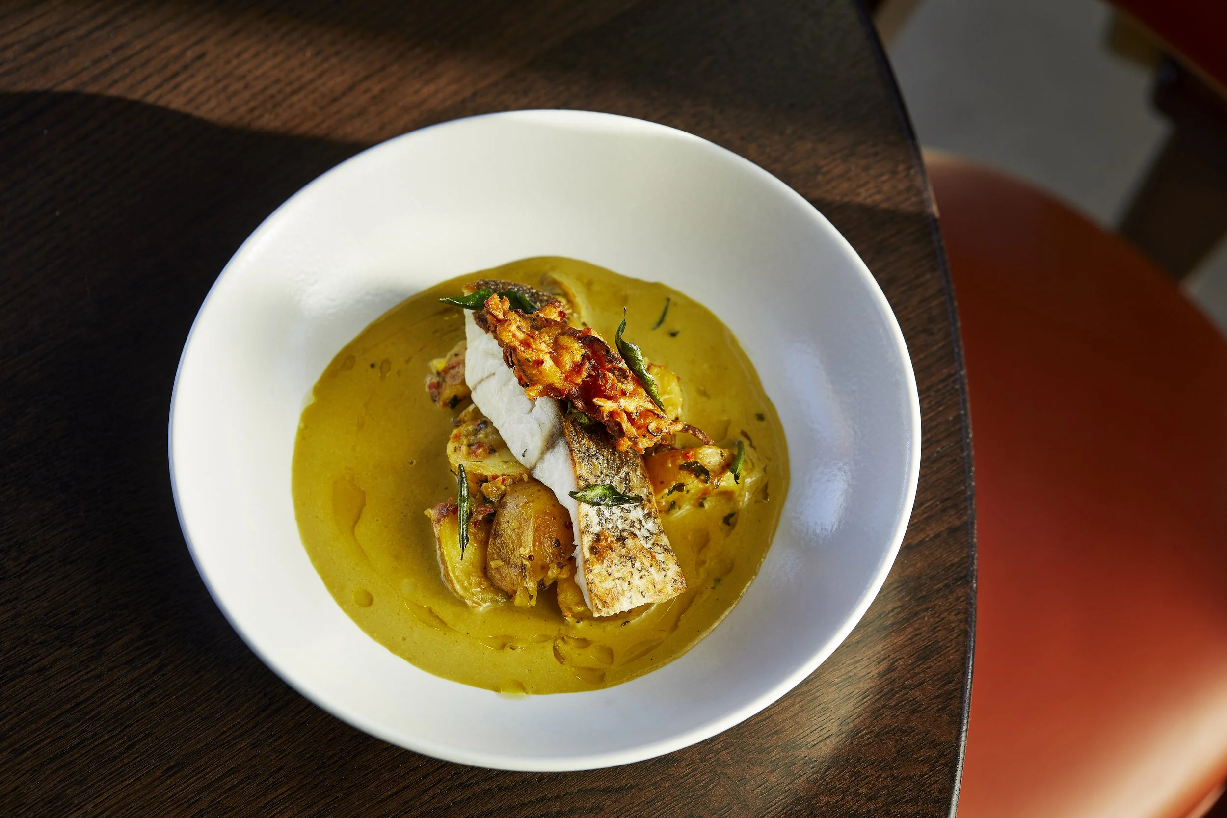 The room hums with a low, confident glamour — all polished wood, soft lighting, and the gentle clink of people having a very nice time. Outside, the terrace leans languidly toward the Thames, where the water glides past like it, too, has reservations. This is part of the Sam Harrison stable (the restaurateur behind Chiswick institution Sam’s Riverside), and you feel that pedigree immediately: a brasserie with just enough swagger, but none of the stiffness. The service is slick without being smug. Our waiter moved with the calm authority of someone who knows exactly when your glass needs refilling — and, crucially, when to leave you alone.